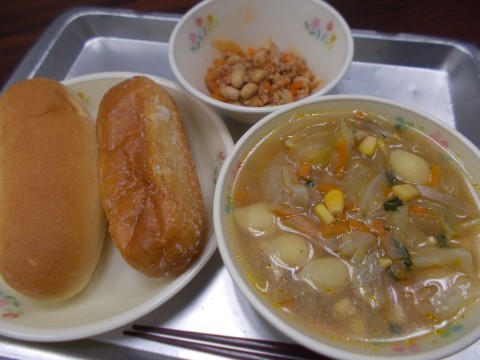 「ミニパン、あげパン、牛乳、マカロニスープ、ミートビーンズ」