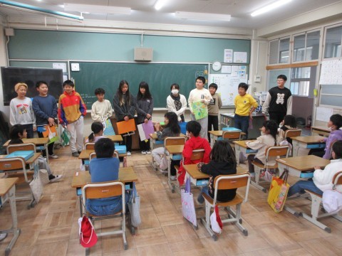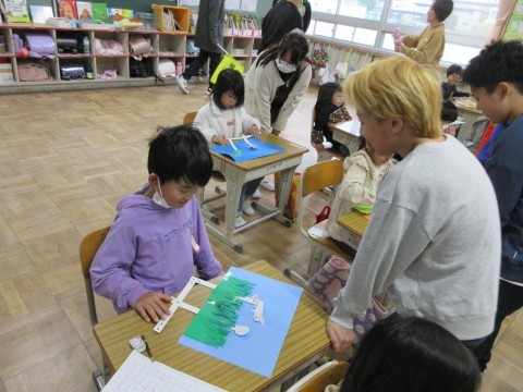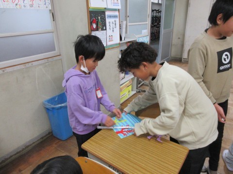 図工の時間に作った「からくリンク」を1年生に見せに行きました。ストーリーを説明したり,遊び方を教えたりして,一緒に楽しい時間を過ごすことができました。喜んでもらえて,6年生もうれしそうでした。