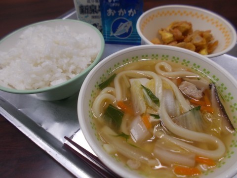 「ごはん、牛乳、あんかけうどん、がね、ふりかけ」