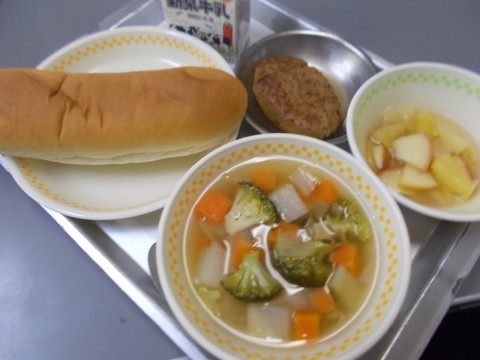 「ミルクパン、牛乳、冬野菜スープ、ハンバーグのソースかけ、とろりフルーツコンポート」
