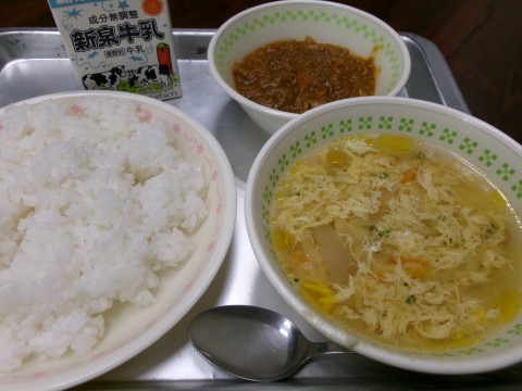 今日から給食が始まります。 メニューは、「ごはん、牛乳、卵スープ、ドライカレー」です。