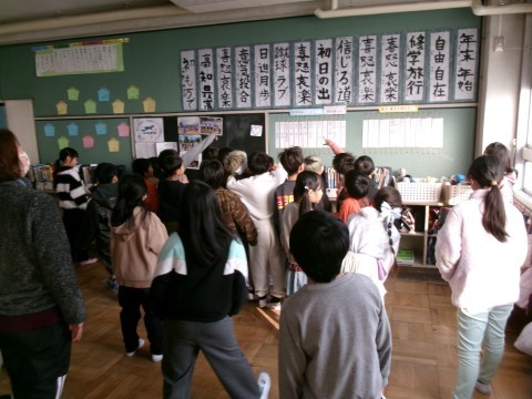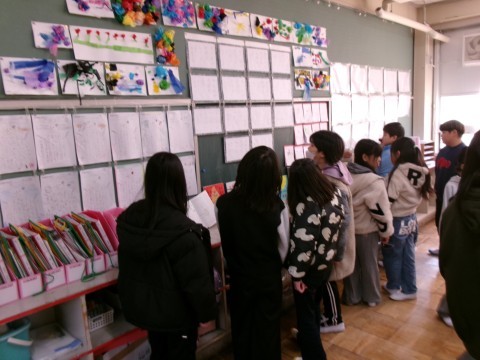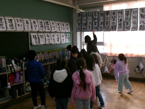 今日の1時間めは、校内書初め展でした。 クラスでほかの学年の書初め作品を鑑賞しました。
