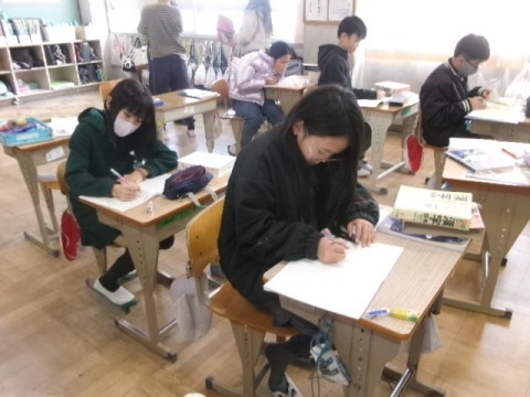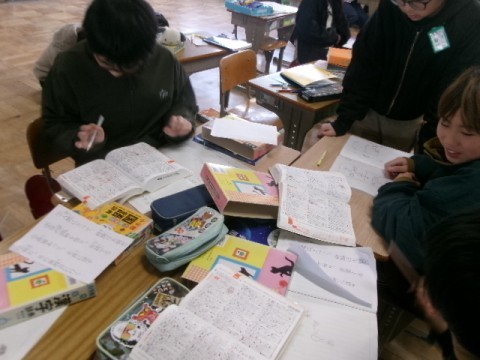 5年生は国語辞典を使って熟語クイズを作りました。お互いにクイズを出し合いながら、「なるほど!」「それは難しい!」と盛り上がる姿が見られました。
