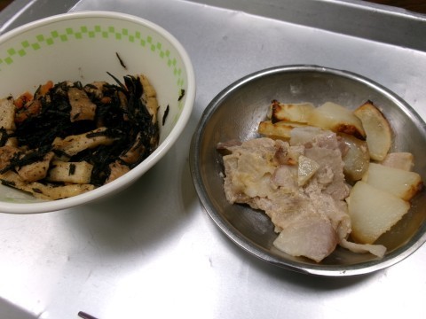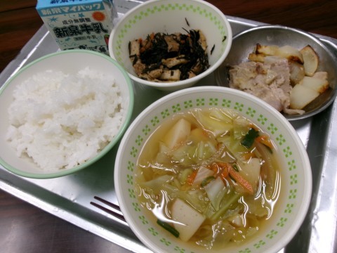 「ごはん、牛乳、野菜たっぷりすまし汁、豚肉のみそガーリック焼、ひじきの甘煮」