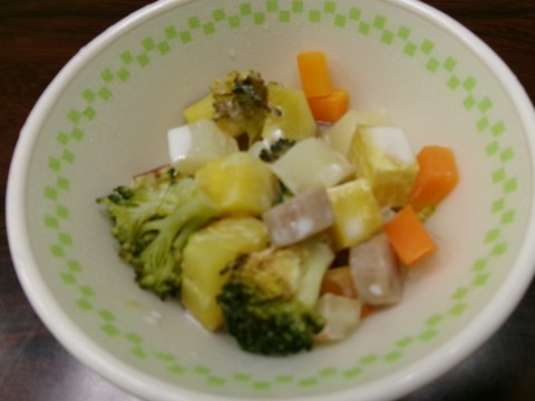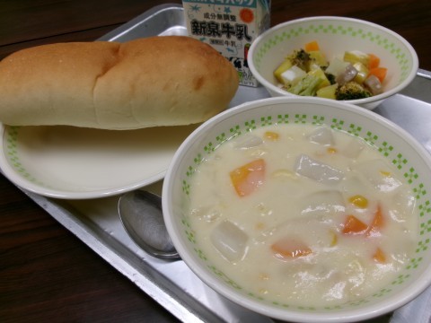 「コッペパン、牛乳、かぶのクリーム煮、コロコロサラダ」