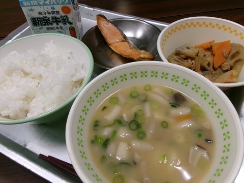 「ごはん、牛乳、すいとん汁、鮭の風味焼、れんこんのきんぴら」