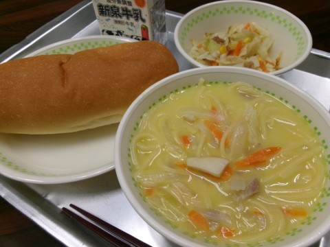 「ミニコッペパン、牛乳、クリームスパゲティ、ホットサラダ」