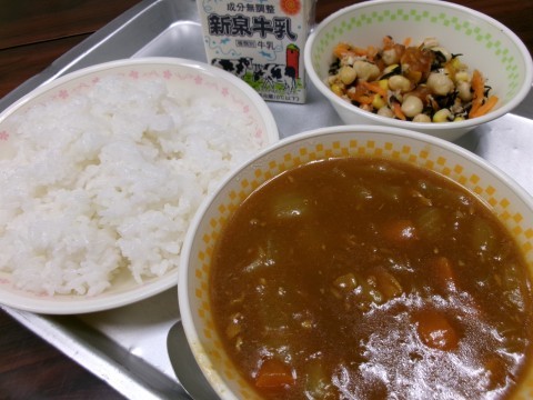 「ごはん、牛乳、ポークカレーライス、豆とひじきのサラダ」