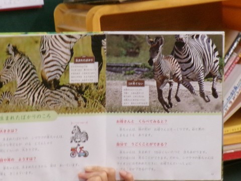 しまうまの赤ちゃんのようすを、絵本(えほん)でまなびます。
