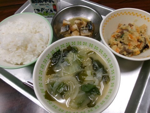 「ごはん、牛乳、みそ汁、焼きさばのみぞれがけ、卯の花」