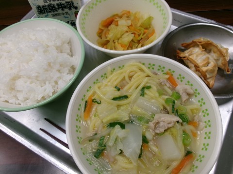 「ごはん、牛乳、とんこつラーメン、焼ぎょうざ、キャベツのソテー」