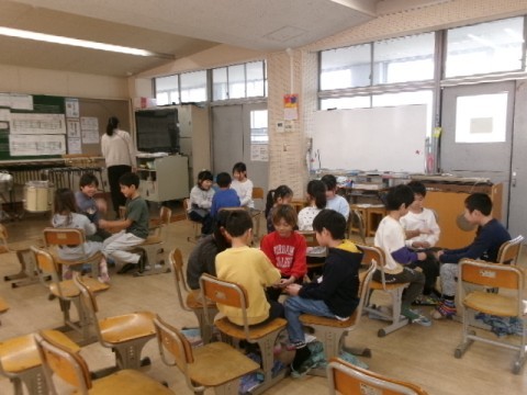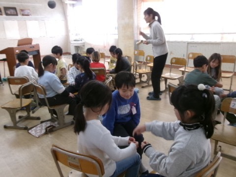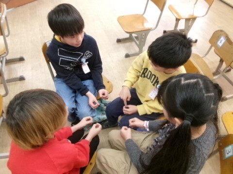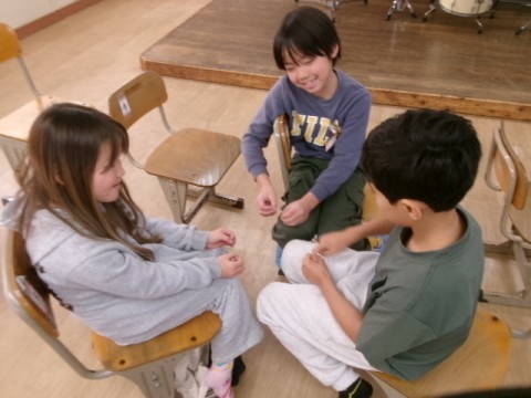 子どもたちは、手で作ったわっかに、歌に合わせてそっと指を差し込んでいくこのゲームを、ドキドキしながら楽しんでいました。
