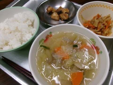 「ごはん、牛乳、塩ちゃんこ汁、さばのごまみそ焼き、もやしの炒め煮」