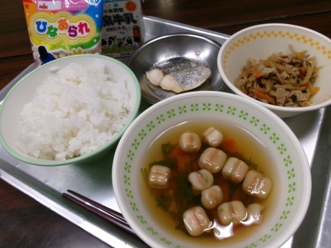 「ごはん、牛乳、すまし汁、さわらの風味焼き、セルフきんぴらちらし、ひなあられ」
