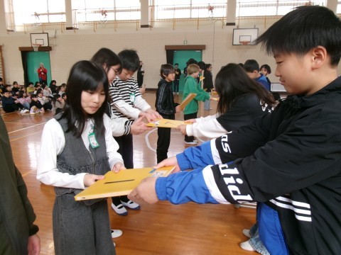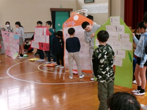 5年生が中心となって、6年生を送る会を行いました。はじめに「なかよしタイム」で縦割り班で活動し、体育館に移動しました。6年生からは各クラスにティッシュボックスのプレゼントがあり、各学年からは6年生への感謝の気持ちを込めた寄せ書きを贈りました。最後に6年生から大迫力の合奏を披露してもらい、拍手で送りました。ひとつずつ行事が終わり、いよいよお別れの時をが近づいてきていることを感じます。