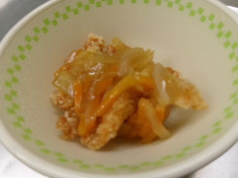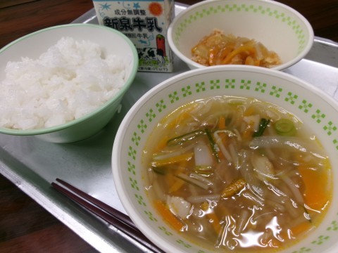 「ごはん、牛乳、春雨スープ、鶏のから揚げ野菜あんかけ」