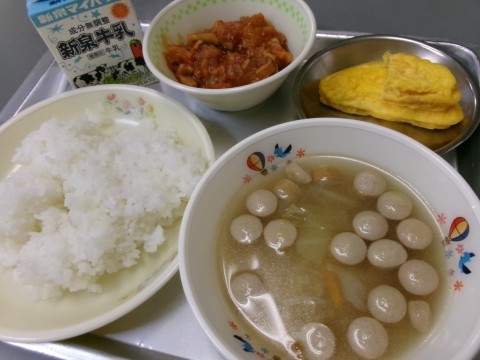 「ごはん、牛乳、野菜スープ、オムレツ、セルフチキンライス」