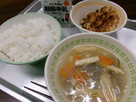 「ごはん、牛乳、豚汁、お好み焼き」