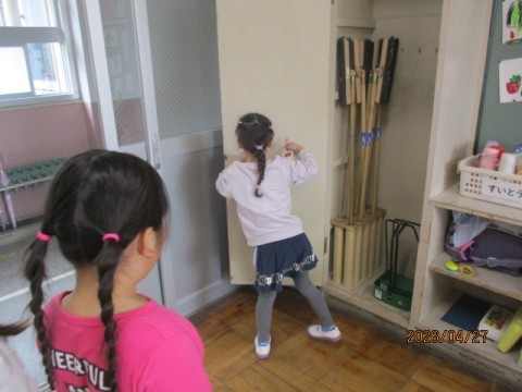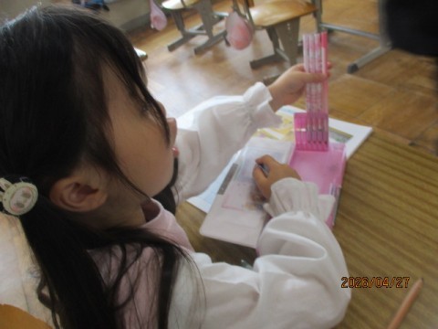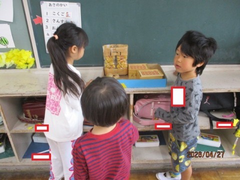 「黒板は前と後ろにあるから,2個」「傘が4本」と,身の回りにある1~5個のものをたくさん見つけることができました。