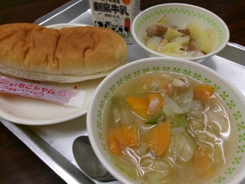 「コッペパン、牛乳、春野菜スープ、ウインナーポテト、いちごジャム」