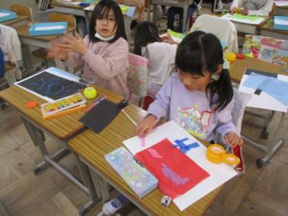 1年生 図工 公開日 2023/12/01 更新日 2023/12/01 1年生 11月30日 和紙をちぎって、何に見えるかを考えました。ちぎった形から、ドラゴン、魚、無人島など、想像を広げて楽しみました。