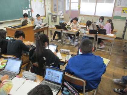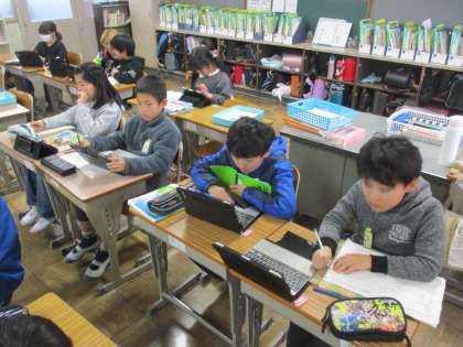 葉や実の色のちがいや大きさの変化など、自分が選んだ視点で1年をかけて、植物がどのように変化したのかをタブレットPCで調べました。