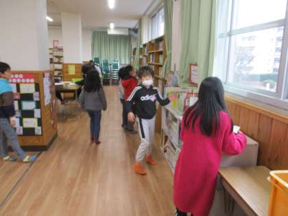1月18日(木) 図書の時間です。たくさんある本の中から読みたい本を探しています。