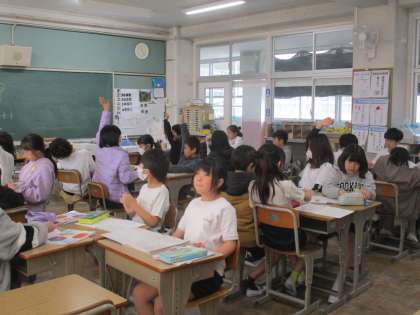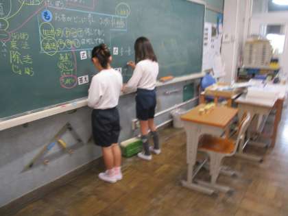 分数のたし算と引き算の演算決定や、分数の表記のしかた等の学習をしています。グループごとに話し合ったり、聞き合ったりしながら学習しました。