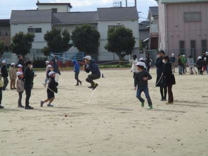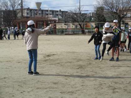 冷たい風が吹く中、なかよし活動班で大なわをしました。