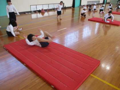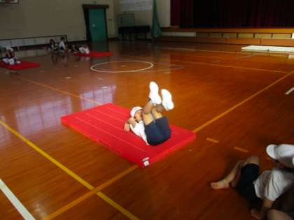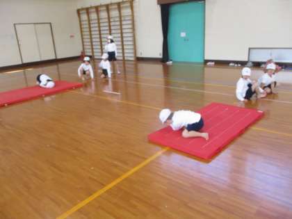 今日は「前回り」と「後ろ回り」に挑戦しました。「難しい!」と言っていましたが、友だちと支えあって、上達しています。