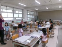 図工室で絵の具を使って、「すいすい ぐるり」と画用紙の上を筆で、おさんぽを楽しみ...