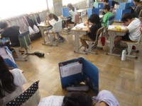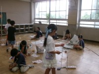 学年広場を広々と使って工作をしました。新聞紙や広告を細くより合わせて、棒を作り、...