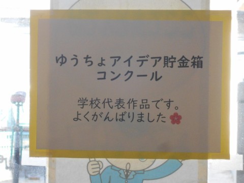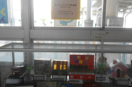 放送室前のガラス棚に,夏休みに作ってきた貯金箱の学年代表作品を展示しています。