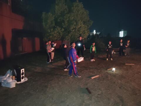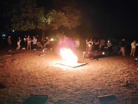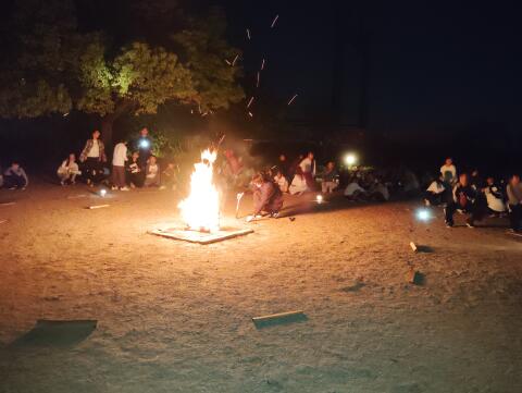 キャンプファイヤーが始まりました。今日は風が強いです。気をつけて進めていきます。