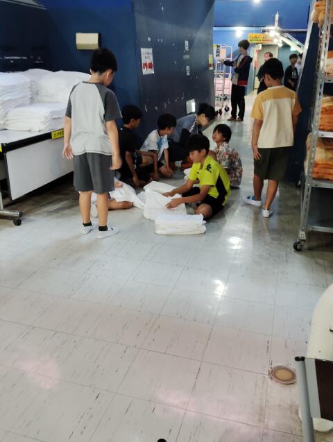 シーツ、かけ布団カバーの返却を協力して行ってます。たたみ方、数はあっているかな?