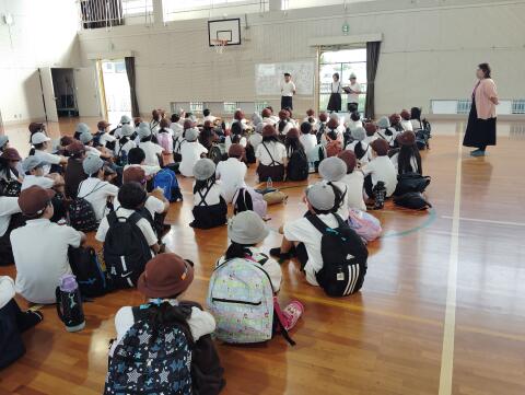 5年生は、今週の月曜日、火曜日、臨海宿泊学習でした。体育館で終わりの集いの様子です。