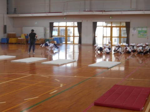 体育館でマット運動にとりくんでいます。