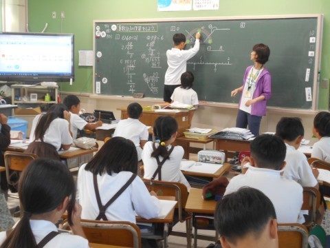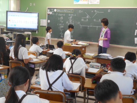 角度を測定する分度器を使い方を,前で演じてもらっています。