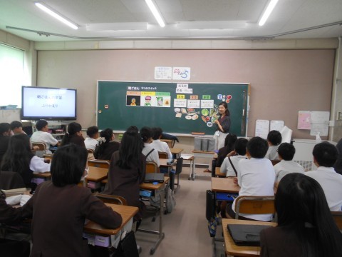 金岡小学校の栄養教諭の先生に来ていただき,朝ごはんについて話をしてもらいました。
