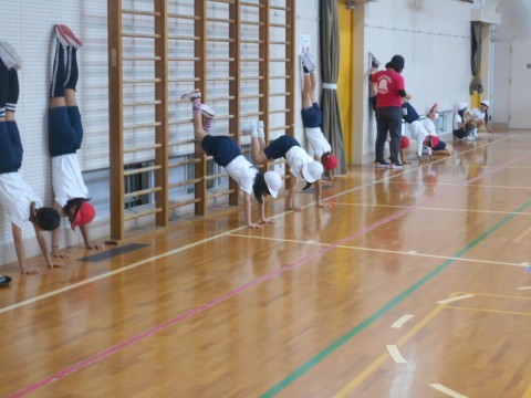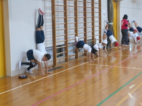 倒立の練習です。今日は壁倒立に挑戦しました。
