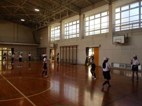 体育館での体育でソフトバレーボールをしています。まずはパスの練習からです。