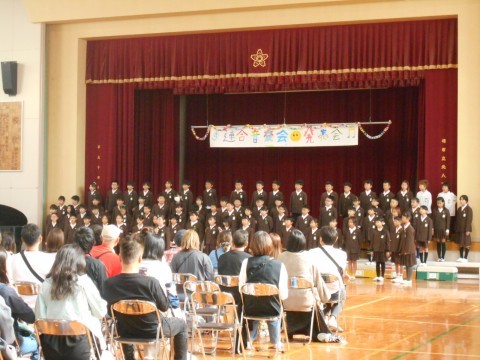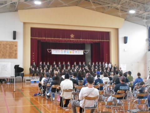 4年生は体育館で連合音楽会の発表曲を見てもらいました。