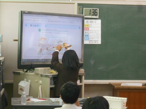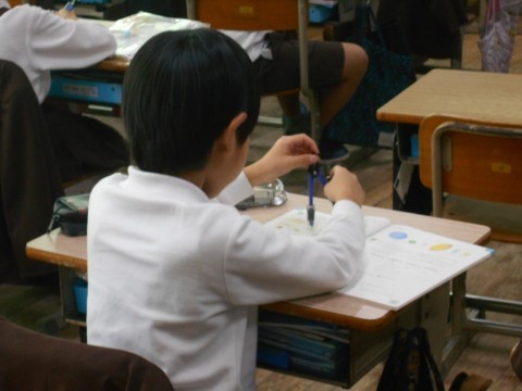みんなの前で先生用のコンパスを使い,説明しながら長さをはかりとる演示を行いました。