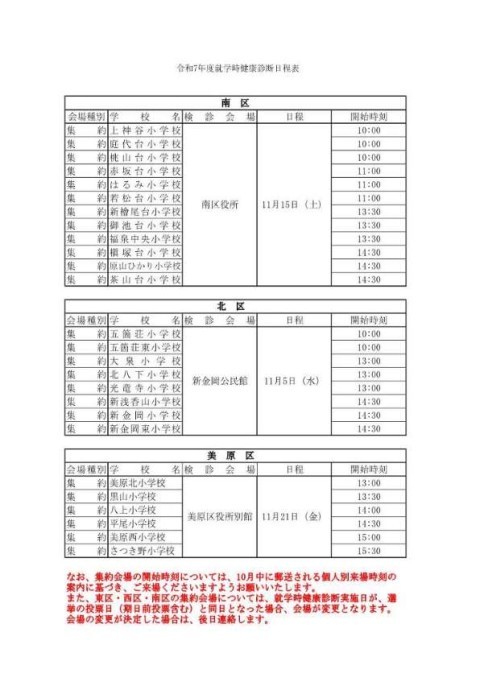 11月5日(水)13時より新金岡公民館で就学時健康診断が予定されています。