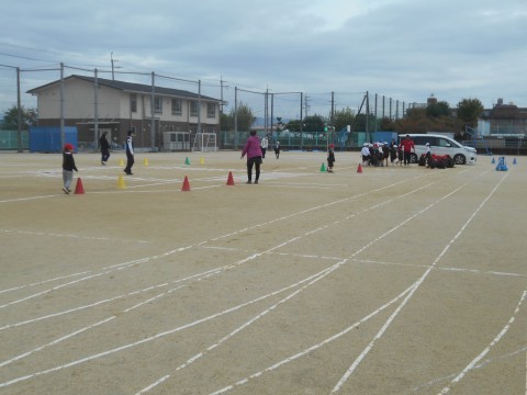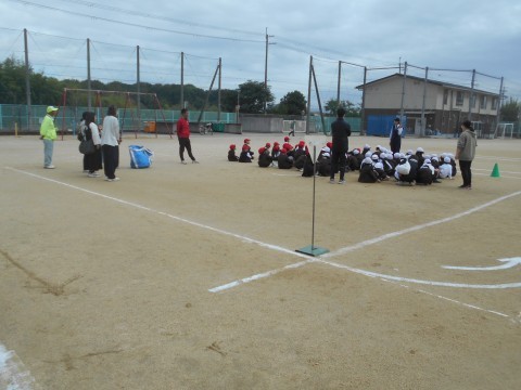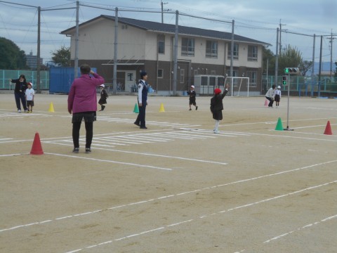 3時間目運動場で,白線でかいた線を仮の道路とみたて,道路の歩き方についての交通安全教室を行いました。