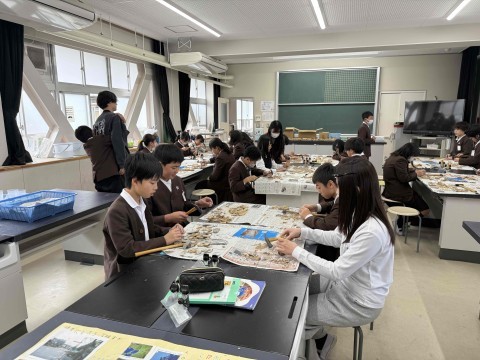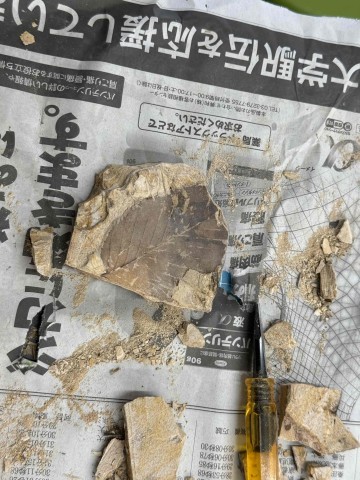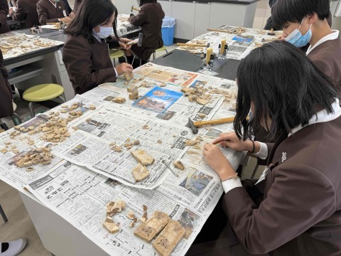 化石を探して観察する授業がありました。金槌で石を砕いてはさまざまな化石を発見。なかなか見つからず、苦戦している子もいましたが,根気強く取り組んでいました。