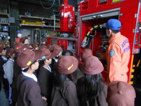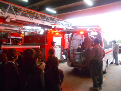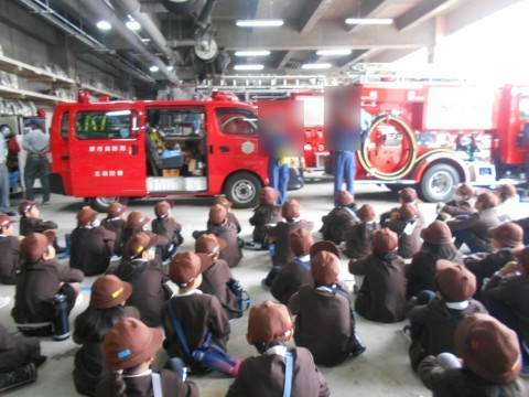大きなはしご車や救急車の車内,消防隊の防火服やポンプ車につなぐホースなど,ふだんは見られないものをいくつも見ることができ,子どもたちは驚きの連続でした。