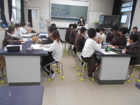 理科室でビーカーや丸底フラスコ,試験管の紹介をしてもらいました。