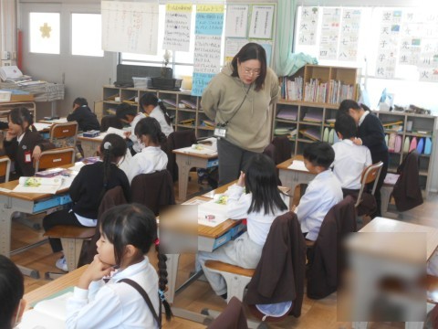 登場人物が何をしたのかそれぞれが作った物語をペアで伝え合っています。