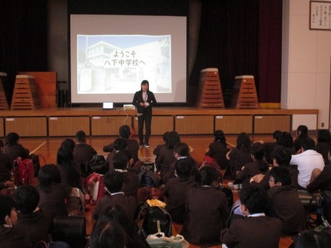 八下中学校を訪問し,生徒会執行部から中学校の紹介をしてもらいました。